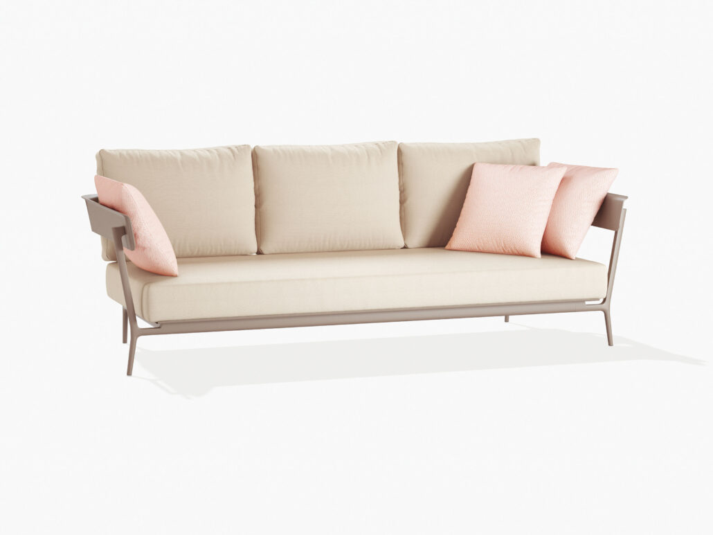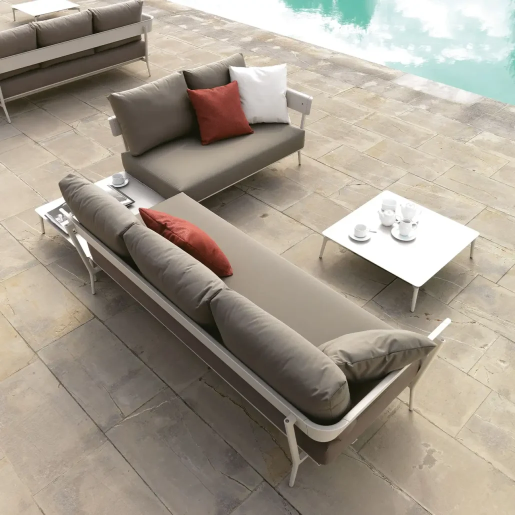 Ein echtes Wohnzimmer für draußen: Aikana ist ein System aus einzelnen, modularen Elementen, die Sie nach Belieben kombinieren können, um entweder großzügige oder gemütliche Sitzecken zu schaffen. Der Rahmen besteht aus Aluminiumdruckguss und stranggepresstem Aluminium, die Kissen sind vollständig abnehmbar.