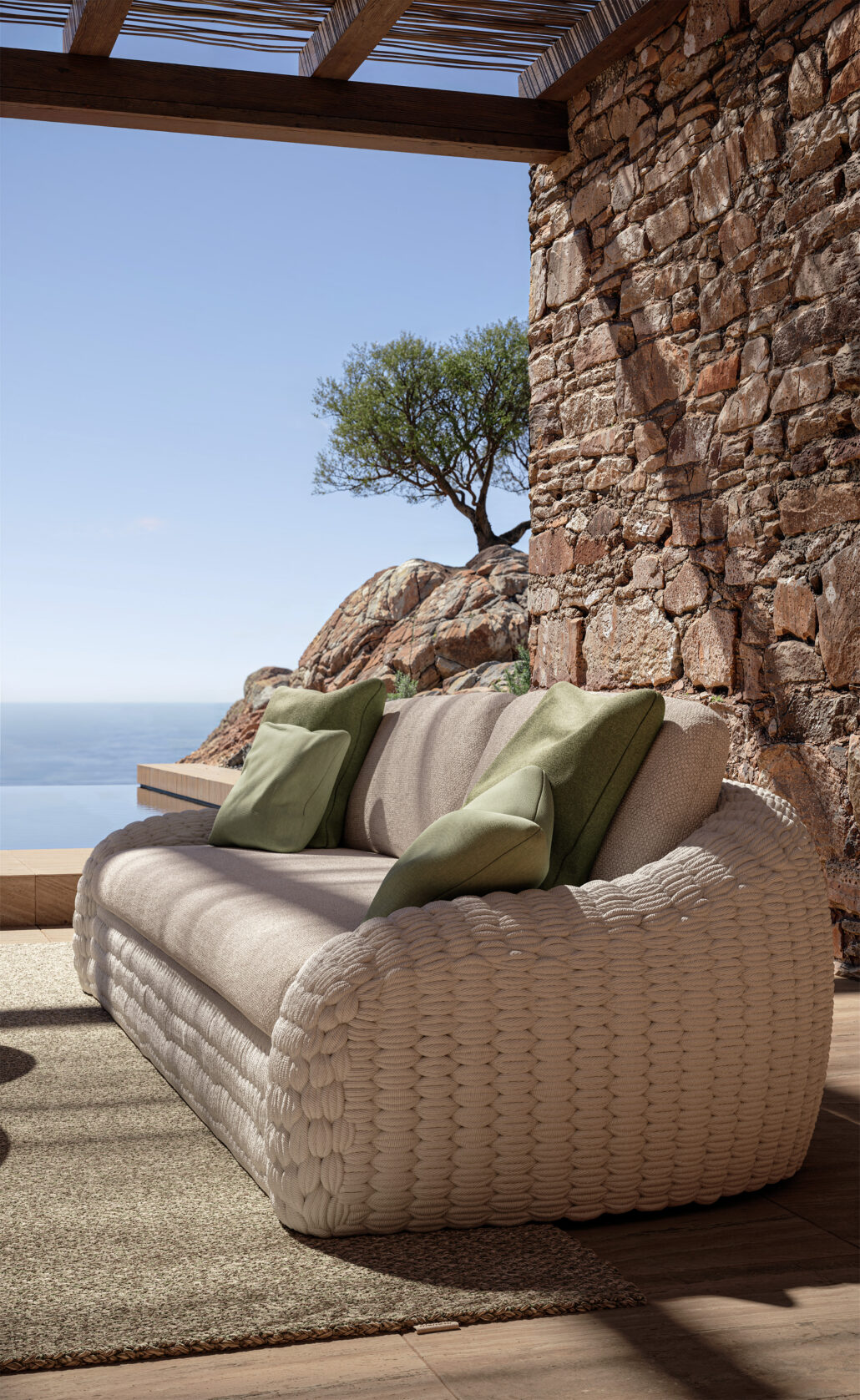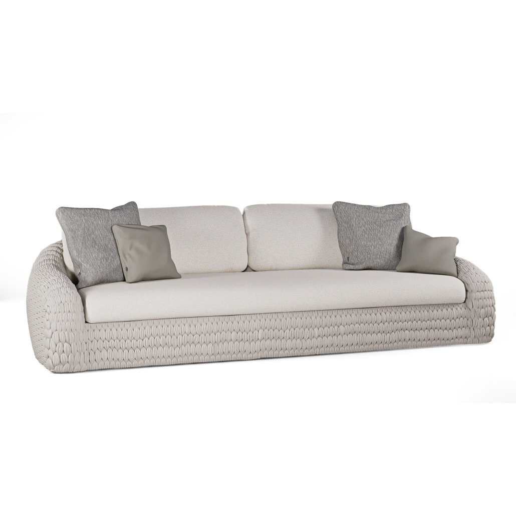 Der Rahmen aus pulverbeschichtetem Aluminium ist vollständig von handgewebtem Rope umhüllt. Dieses Seiltextil sorgt für atmungsaktiven Komfort und eine elegante Optik. Die tiefen und weich gepolsterten Sitzflächen machen jede Sitzposition bequem und einladend.