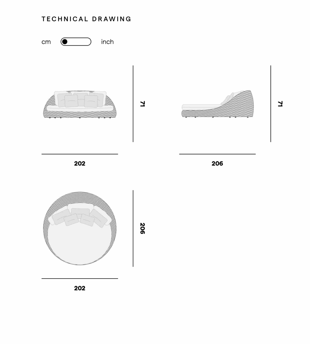 Der Rahmen aus pulverbeschichtetem Aluminium ist vollständig von handgewebtem Rope umhüllt. Dieses Seiltextil sorgt für atmungsaktiven Komfort und eine elegante Optik. Die tiefen und weich gepolsterten Sitzflächen machen jede Sitzposition bequem und einladend.