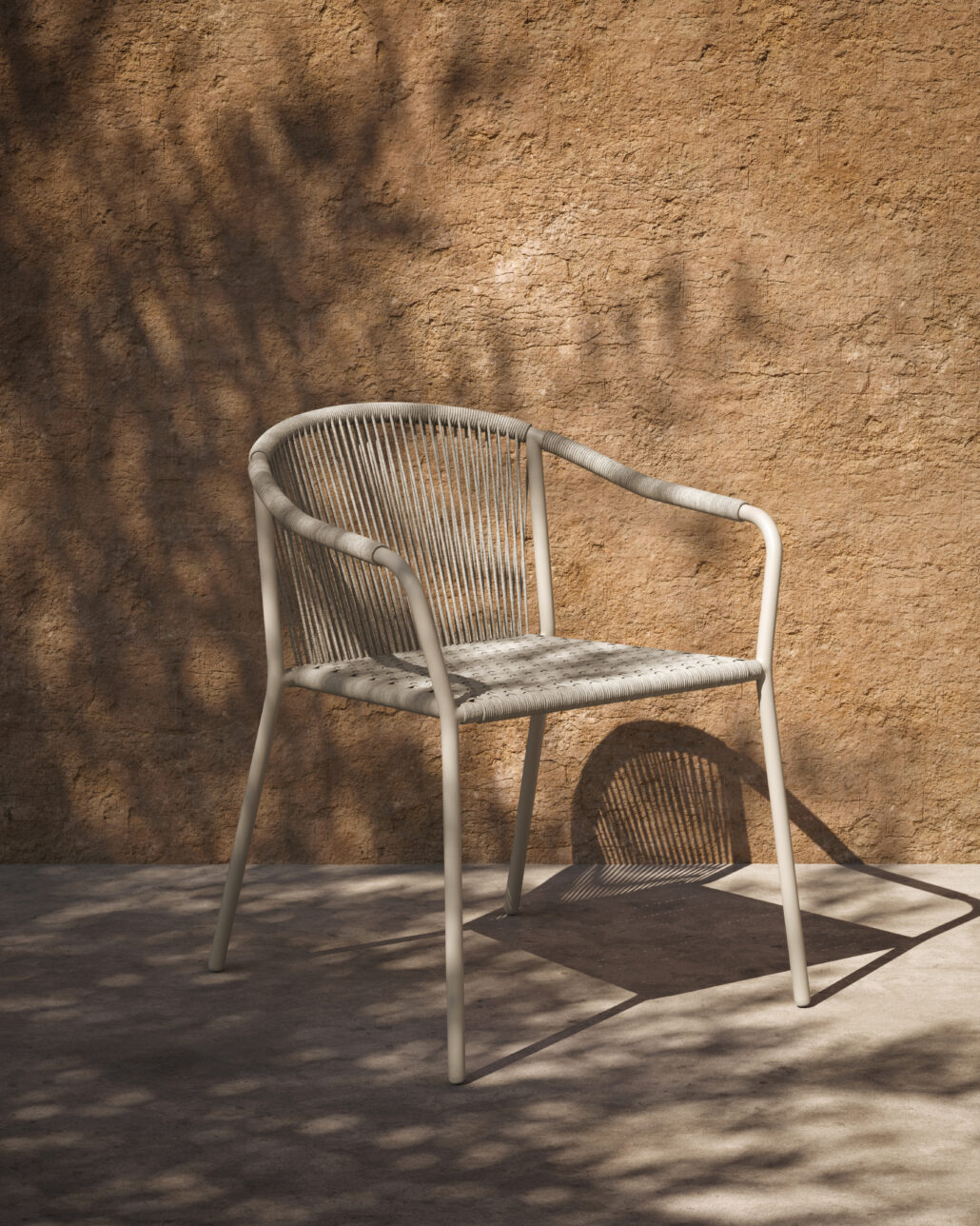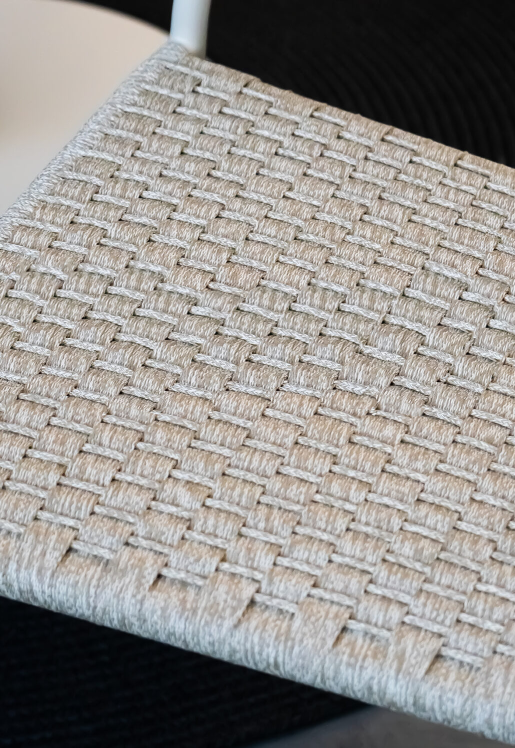 Das Gestell besteht aus wetterfestem Aluminium, das in verschiedenen Pulverbeschichtungen erhältlich ist. Sitz- und Rückenfläche sind mit einem hochwertigen Outdoor-Seilgeflecht oder einem strapazierfähigen Textil bespannt – beide Varianten sind UV-beständig, farbecht und pflegeleicht. So bleibt der Stuhl auch nach vielen Saisons im Freien ein echtes Highlight.