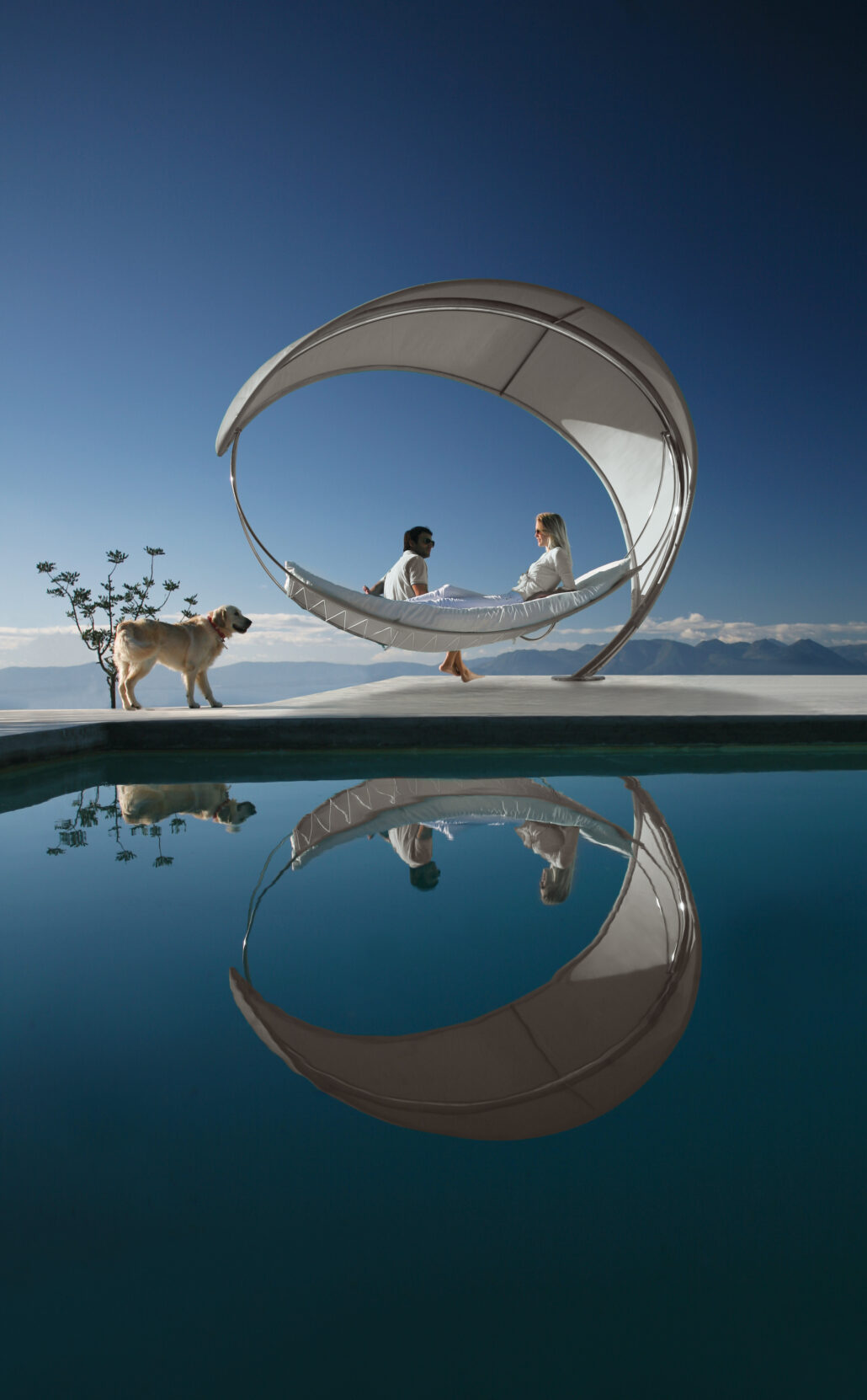 Inspiriert von der Leichtigkeit des Meeres, verbindet das Design der WAVE Hängematte organische Formen mit moderner Technik. Die schwebende Liegefläche scheint förmlich zu fliegen – gehalten von einer filigranen, aber stabilen Aluminiumstruktur. Optional lässt sich die Hängematte mit einem Sonnenschutz ausstatten, der stilvollen Schatten spendet und das Gefühl von Geborgenheit noch verstärkt.
