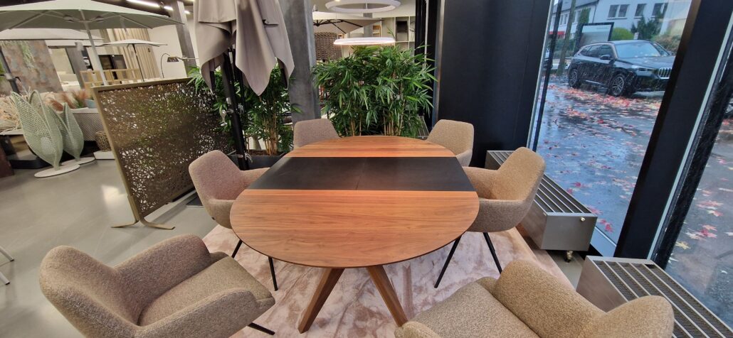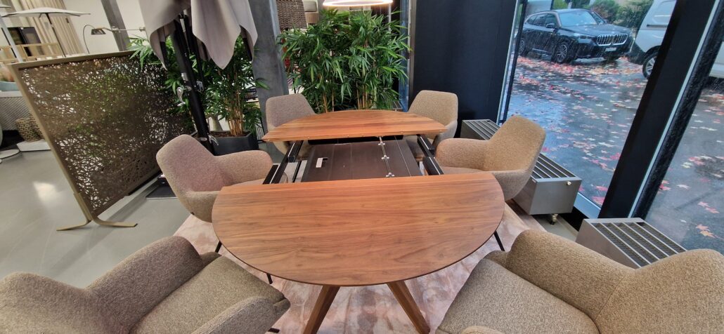 In unserem Showroom Traumwerk in Wallisellen präsentieren wir den Capri Tisch in der runden Variante mit einem Durchmesser von 130 cm. Dank einer integrierten Auszugsklappeinlage lässt sich der Tisch im Handumdrehen auf 190 cm verlängern – ideal, um spontanen Besuch oder größere Runden komfortabel unterzubringen.